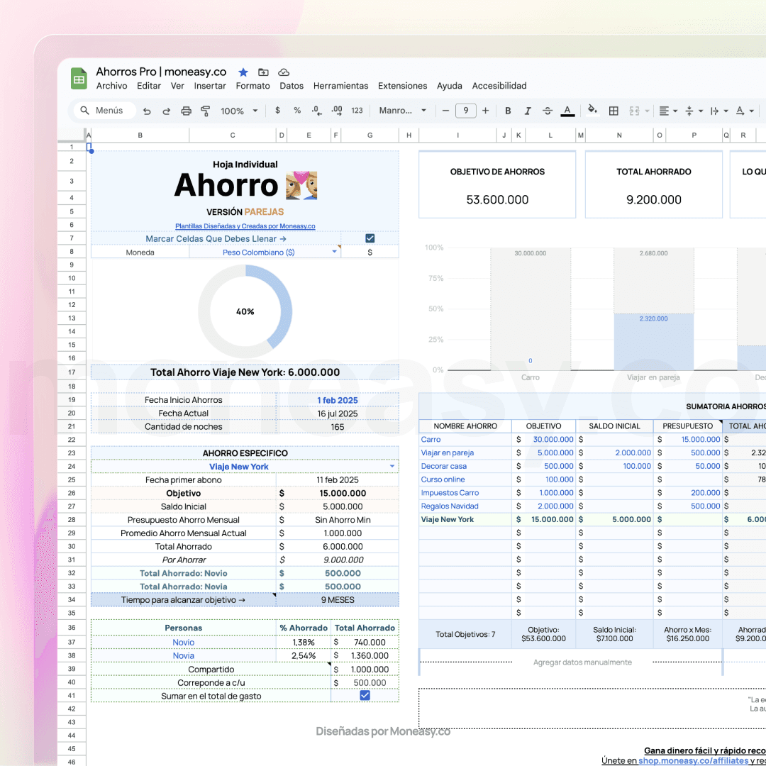 Construye tu futuro financiero en equipo. Esta plantilla unifica los ingresos de ambos y divide las metas de ahorro de forma proporcional y automática. La herramienta perfecta para tener metas claras, transparencia total y una visión compartida de su patrimonio